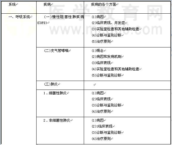 | 2.咳嗽与咳痰 | (1)常见病因 (2)临床表现 (3)伴随症状及临床意义 | |