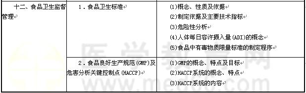 | 十一、食物中毒及其预防 | 1.食源性疾病与食物中毒 | (1)食源性疾病及食物中毒的概念 (2)食物中毒的分类 (3)食物中毒的发病特点及流行病学特点 |