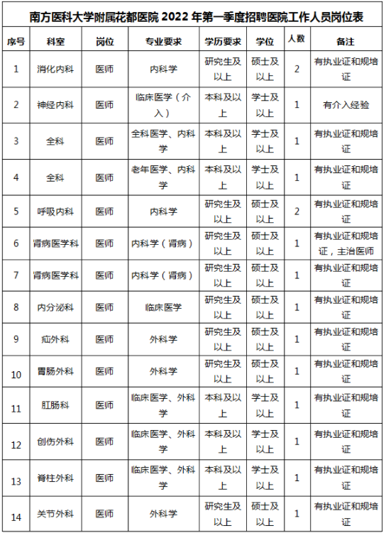 具体招聘岗位见《南方医科大学花都医院2022年第一季度招聘医院工作人员岗位表》(文末附件)。