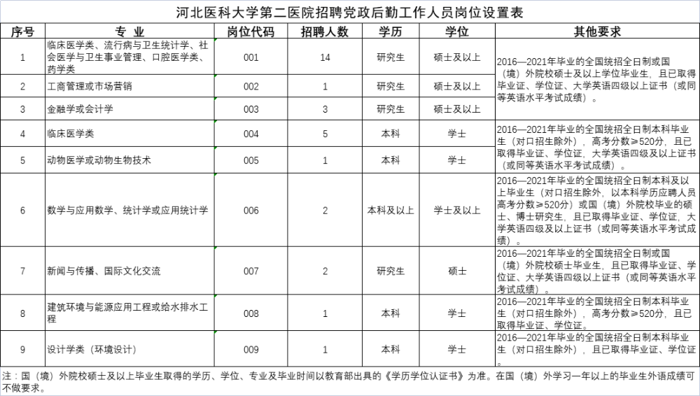 附件1:《河北医科大学第二医院招聘党政后勤工作人员岗位设置表》(2020年3月)