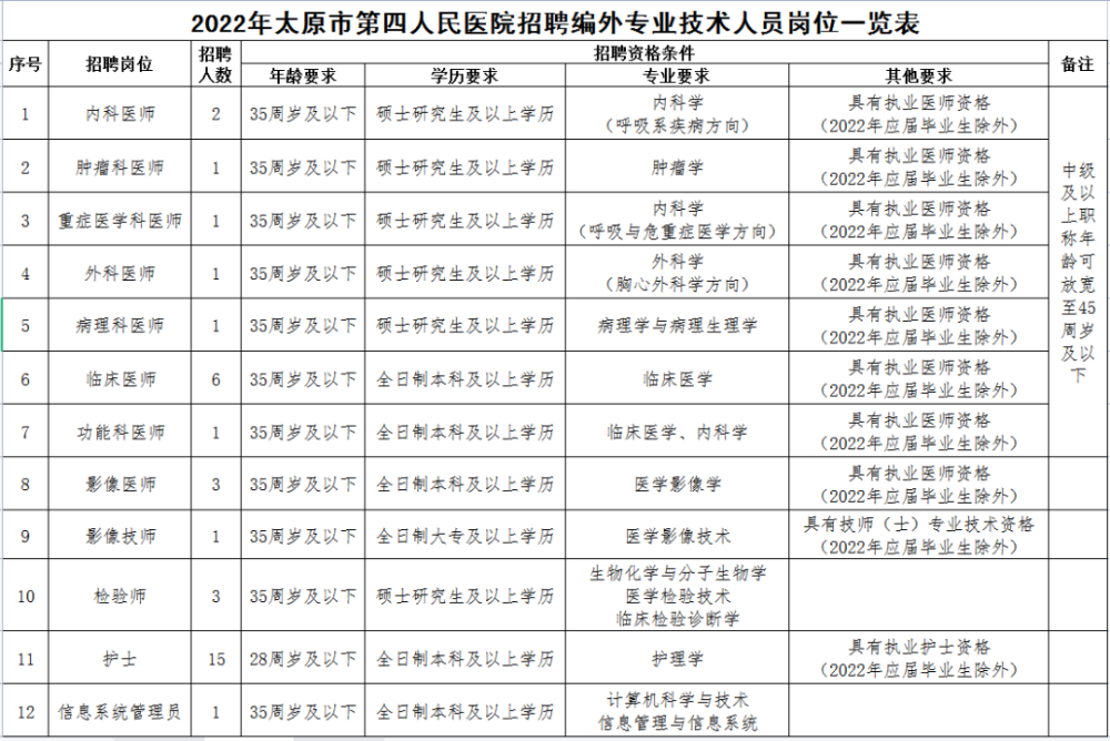 附:《2022年太原市第四人民医院招聘编外专业技术人员岗位一览表》