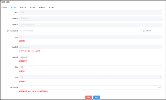 (2)基本信息会根据考生注册时填写的内容自动引用,如未引用性别、出生日期,考生可手动选择,民族和健康状态请根据实际情况下拉选择。