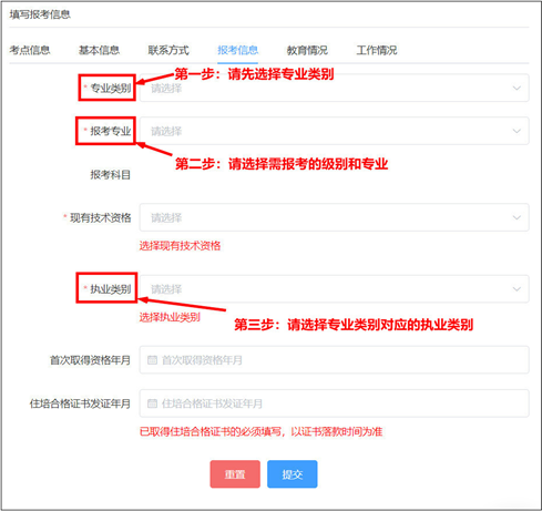 考生须根据所选的专业类别,勾选对应的执业类别;执业类别不为“无”时,首次注册年月不能为空。