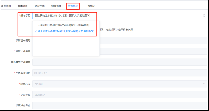 (5)填写教育情况,点击“报考学历”后会显示在注册过程中对【学历学位信息维护】的相关内容,可直接引用其中对应的学历信息。