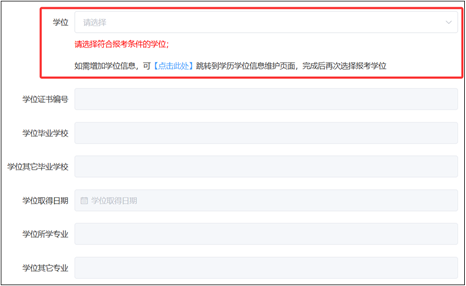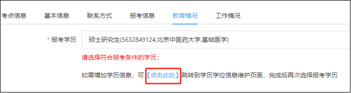 如引用的学历信息有误,请按照页面提示(如下图所示),在“学历学位信息维护”页面添加正确的学历信息后,再重新引用。
