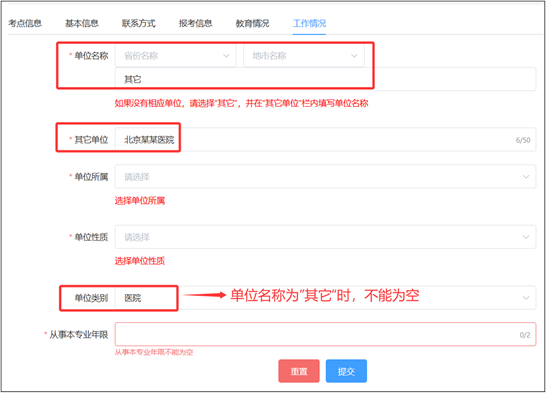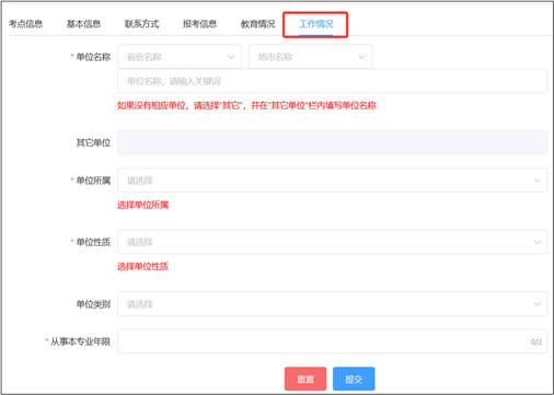 (6)填写工作情况,包括“单位名称”、“单位所属”、“单位性质”、“单位类别”和“从事本专业年限”。