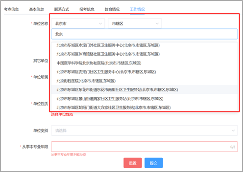 填写“单位名称”时可先选择省市,再输入关键字(不可输入单位缩写、简称)检索单位名称,并在下拉列表中选择相应单位。
