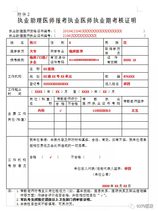 附件2、执业助理医师报考执业医师执业期考核证明填写示例