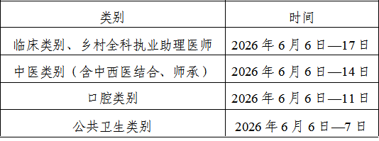 2026年,报考临床、中医(含中西医结合、师承)、口腔、公共卫生类别的考生参加医师资格考试实践技能考试均在国家实践技能考试基地进行,考试合格者,成绩2年有效;报考乡村全科执业助理医师的考生,成绩限当年有效。具体考试时间和地址详见准考证。
