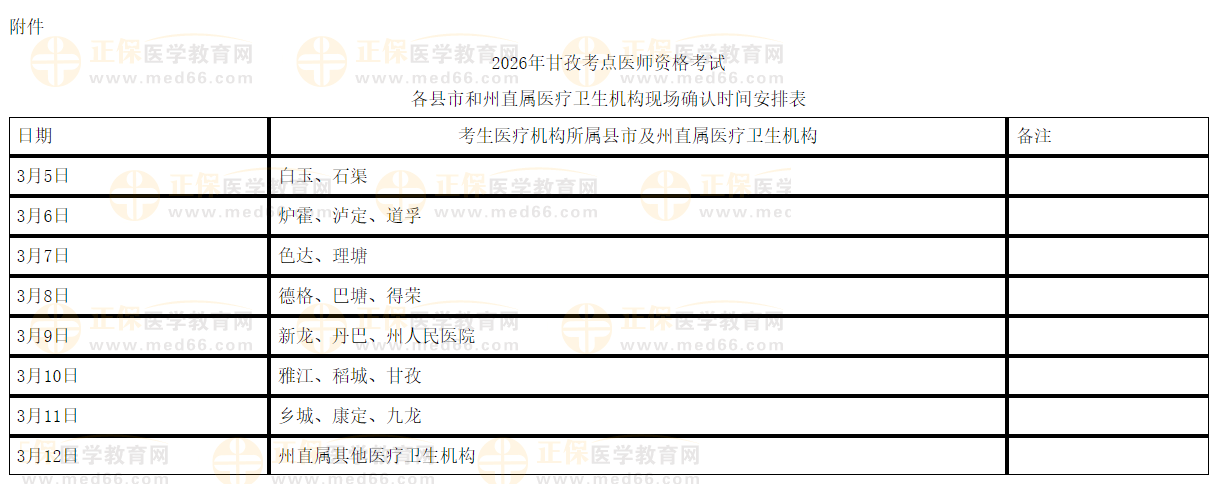 2、考点现场审核时间:2026年3月5日至2026年3月12日。各报名点需将报名考生(包括实践技能考试免试考生)相关报名资料原件及复印件由专人报送至甘孜考点(甘孜卫校考试中心)进行现场确认,并积极配合考点完善相关资料。