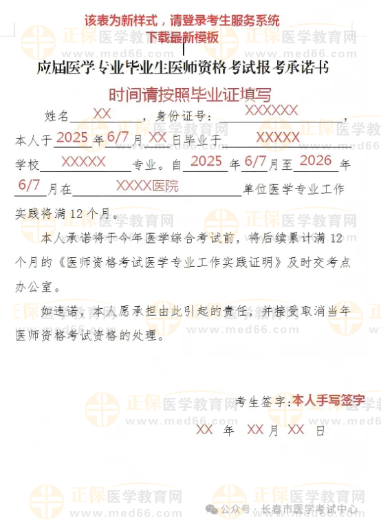 应届毕业生还需提供《应届医学专业毕业生医师资格考试报考承诺书》,请登录国家医学考试网考生服务系统下载(新版);