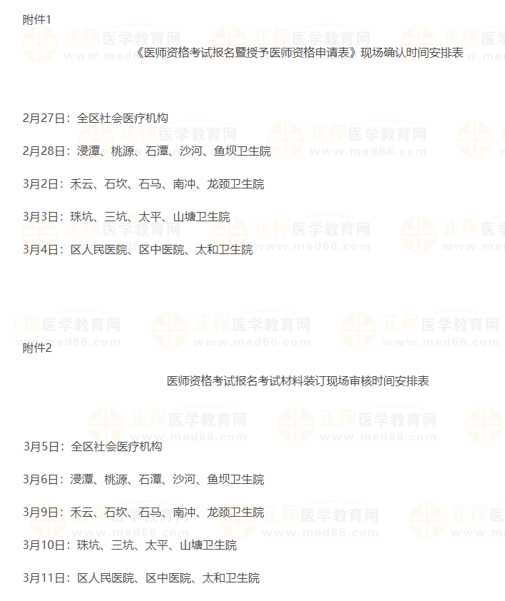 (一)各医疗卫生单位考生(含村卫生站)报名的现场资格审核由各单位负责专项工作的人员集中到区卫生健康局医政医管股审核,个人自行现场审核的不予受理。社会医疗机构按照附件1、2的时间安排表进行现场审核,超过安排表时间的不予受理。