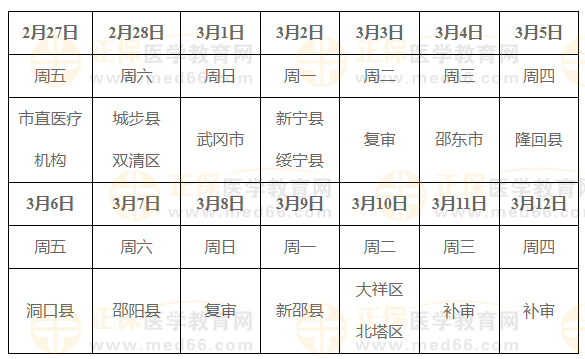 (一)时间安排:现场审核时间为2026年2月27日至2026年3月10日(工作时间:上午9:00-12:00,下午13:30-17:00),3月3、8日为复审日不接受考生递交资料,补审时间为通过考点同意特殊原因错过确认时点的考生递交资料。具体县市区递交资料时间安排如下,其他未清楚事宜可咨询市医师资格考试考点办公室,电话0739-5480738。
