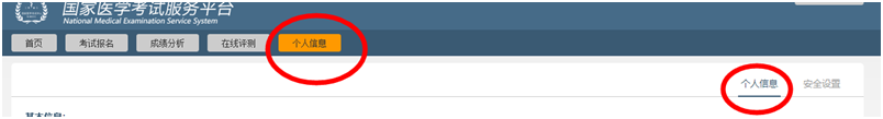 考生用户注册成功后首次进入系统将直接跳转至个人信息模块,再次登录后将显示首页信息。通过点击“个人信息”标签进入,开始完善个人信息。