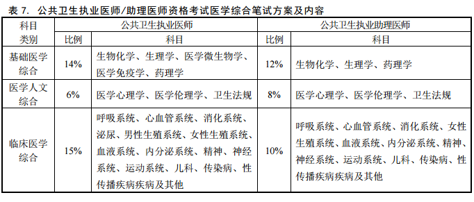 西医类医师资格考试医学综合笔试测试内容、考试形式以国家卫生健康委员会医师资格考试委员会审定颁布的《医师资格考试大纲》为依据。临床、口腔、公共卫生执业医师和执业助理医师以及乡村全科执业助理医师资格考试方案及内容见表5—表8。