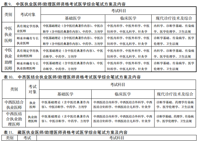 中医类医师资格考试医学综合笔试内容、考试形式以原卫生部医师资格考试委员会审定颁布的《医师资格考试大纲(中医、民族医、中西医结合医师)》为依据。执业医师和执业助理医师考试方案及内容见表9—表17。