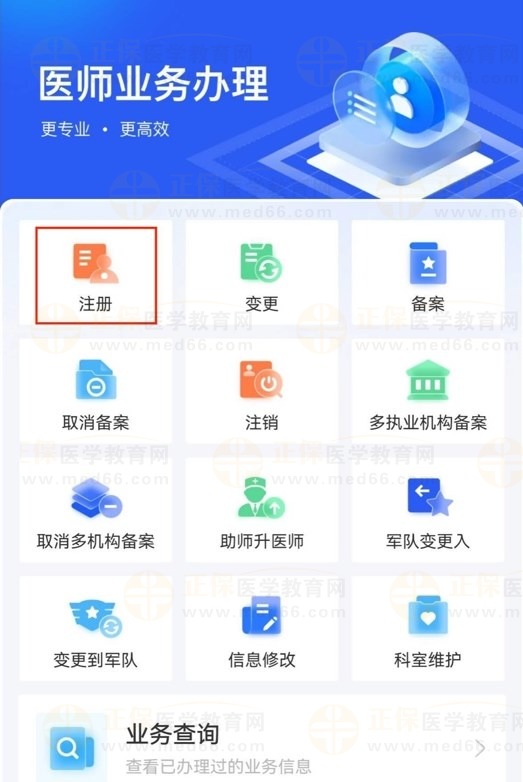 3、在医师个人端“业务申请”中选择“注册”申请“点击进入”