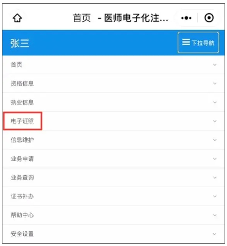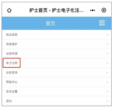 ④点击右上角【下拉导航】进入【电子证照】功能;