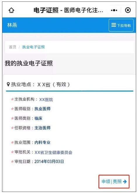 ⑤在执业电子证照功能界面,点击【申领|亮照】;