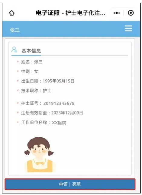 ⑥符合申领护士电子证照条件,直接亮照成功(不需要医疗机构审核)。