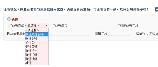 7.助理升执业的考生,必须在下图中选择“执业助理医师”,证书编号即医师资格证书编号,所有信息准确填写后,勾选左上角的“选择”。