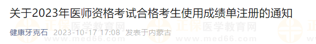 内蒙古牙克石考点2023年医师资格考试合格考生请注意! 2023年医师资格考试合格分数线已经下发,合格考生信息已进入医师资格管理信息系统。2023年医师资格考试合格考生使用成绩单注册已经开始,以下为官方通知,请相关考生了解。